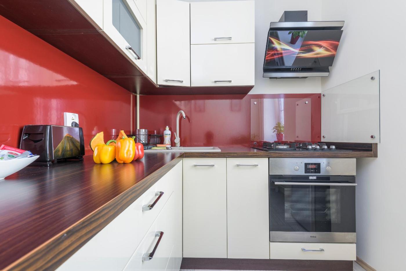 W apartamencie do dyspozycji gości przygotowano sypialnię (1), kuchnię ze standardowym wyposażeniem, takim jak lodówka i piekarnik, a także łazienkę (1) z wanną. Wyposażenie obejmuje także pralkę oraz telewizor z płaskim ekranem z dostępem do kanałów kablowych. W apartamencie zapewniono ręczniki i pościel.